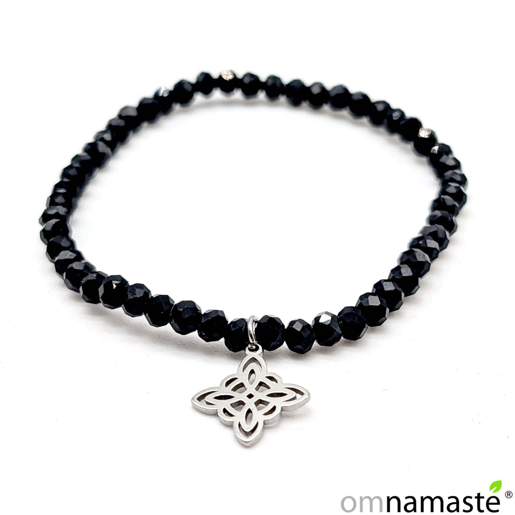 Pulsera de cristal negro con nudo de brujas, símbolo ancestral de protección y poder. El cristal negro actúa como escudo energético, absorbiendo las energías negativas y fortaleciendo tu campo áurico. El nudo de brujas, tejido con intención milenaria, amplifica la conexión con tu intuición y sabiduría interior. Detalles en acero plateado que realzan su elegancia mística. Llévala como amuleto de transformación personal y equilibrio espiritual. Perfecta para quienes buscan potenciar su práctica energética y protección diaria.